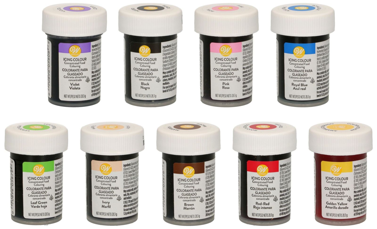 Wilton Icing Color Braun, Goldgelb, Lila, Königsblau, Rot, Rosa, Blattgrün, Elfenbeinfarben und Schwarz sind konzentrierte Lebensmittelfarbe.