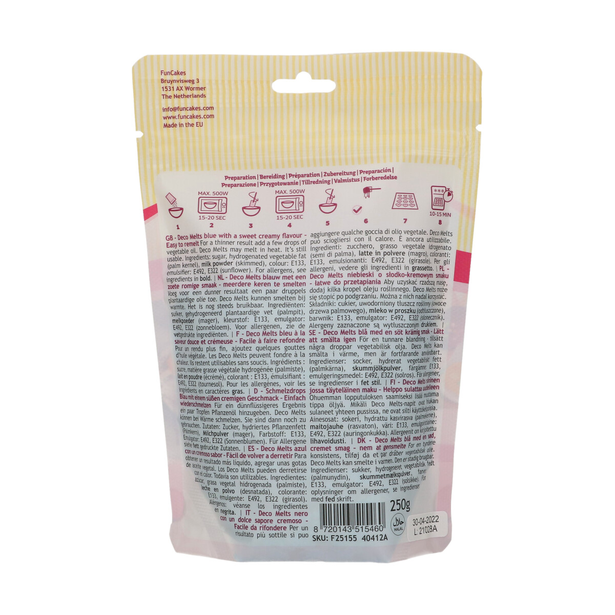 Die FunCakes Deco Melts Blau bieten Ihnen viele verschiedene Möglichkeiten. Sie lassen sich einfach schmelzen und in jede gewünschte Form gießen. Das macht sie zu einem der vielseitigsten Produkte von FunCakes. Hervorragend geeignet zum Drippen über Kuchen, Torten und Cupcakes, zum Dippen von Keksen, Früchten und Cake Pops, zur Herstellung von Lutschern und Tropfkuchen und vielen weiteren Süßigkeiten. Mit ihrer Vielseitigkeit und guten Handhabung sind sie ein unverzichtbares Werkzeug für jeden Konditor oder Hobbybäcker. Die FunCakes Deco Melts sind bereits in vielen verschiedenen Farben erhältlich. Auch eigene Farbkreationen sind möglich, indem Sie die FunCakes Deco Melts White mit den fettlöslichen Lebensmittelfarben mischen.