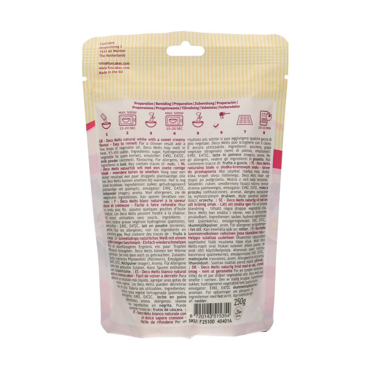 Die FunCakes Deco Melts Natürliches Weiß bieten Ihnen viele verschiedene Möglichkeiten. Sie lassen sich einfach schmelzen und in jede gewünschte Form gießen. Das macht sie zu einem der vielseitigsten Produkte von FunCakes. Hervorragend geeignet zum Drippen über Kuchen, Torten und Cupcakes, zum Dippen von Keksen, Früchten und Cake Pops, zur Herstellung von Lutschern und Tropfkuchen und vielen weiteren Süßigkeiten. Mit ihrer Vielseitigkeit und guten Handhabung sind sie ein unverzichtbares Werkzeug für jeden Konditor oder Hobbybäcker. Die FunCakes Deco Melts sind bereits in vielen verschiedenen Farben erhältlich. Auch eigene Farbkreationen sind möglich, indem Sie die FunCakes Deco Melts White mit den fettlöslichen Lebensmittelfarben mischen.