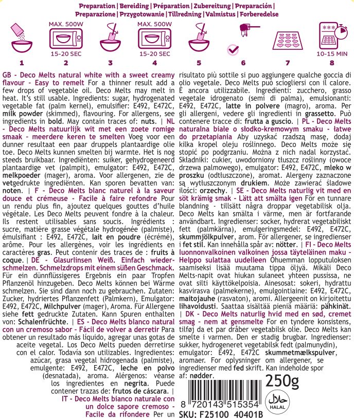 Die Deco Melts haben einen herrlich süß-cremigen Geschmack. Die Herstellung erfolgt ohne echte Schokolade.