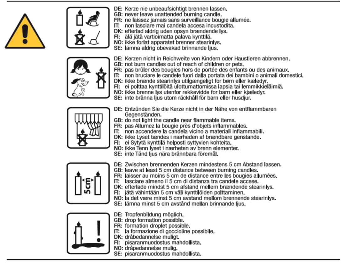 Kerzen nie unbeaufsichtigt brennen lassen. Kerzen nicht in Reichweite von Kindern oder Haustieren abbrennen. Entzünden Sie die Kerze nicht in der Nähe von entflammbaren Gegenständen. Zwischen brennenden Kerzen mindestens 5 cm Abstand lassen. Tropfenbildung möglich.