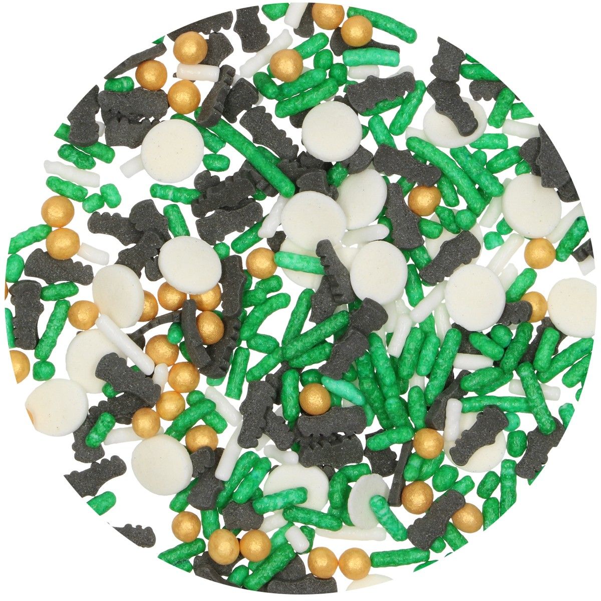 Das FunCakes Sprinkle Medley Football ist eine essbare Streuselmischung aus bunten Perlen, Konfettis, Stäbchen und kleinen Zuckerfiguren in Form von Fussballschuhen. Sie ist hervorragend geeignet für das Dekorieren und Verzieren von Kuchen, Torten, Cupcakes, Muffins, Keksen, Desserts, Eis und vielen weiteren süßen Leckereien.