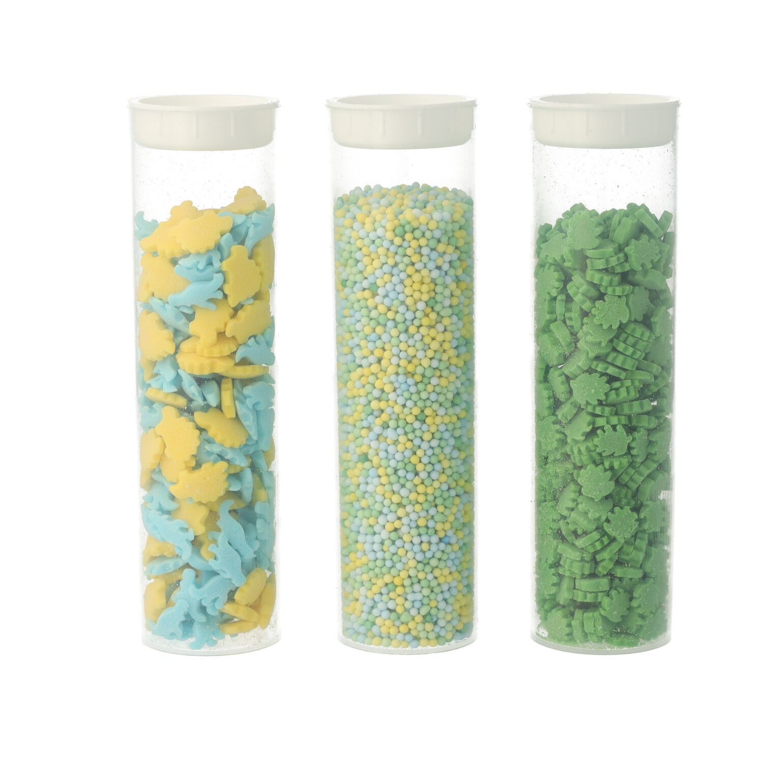 Tritt ein, in eine Welt vor unserer Zeit! Egal ob Farnblätter, Perlchen-Mix oder Dinos, mit dem 3er Streusel Set Dino-Welt verwandelst du jedes Gebäck in einen phantasievollen Hingucker. Ideal für Themenpartys oder Kindergeburtstage.