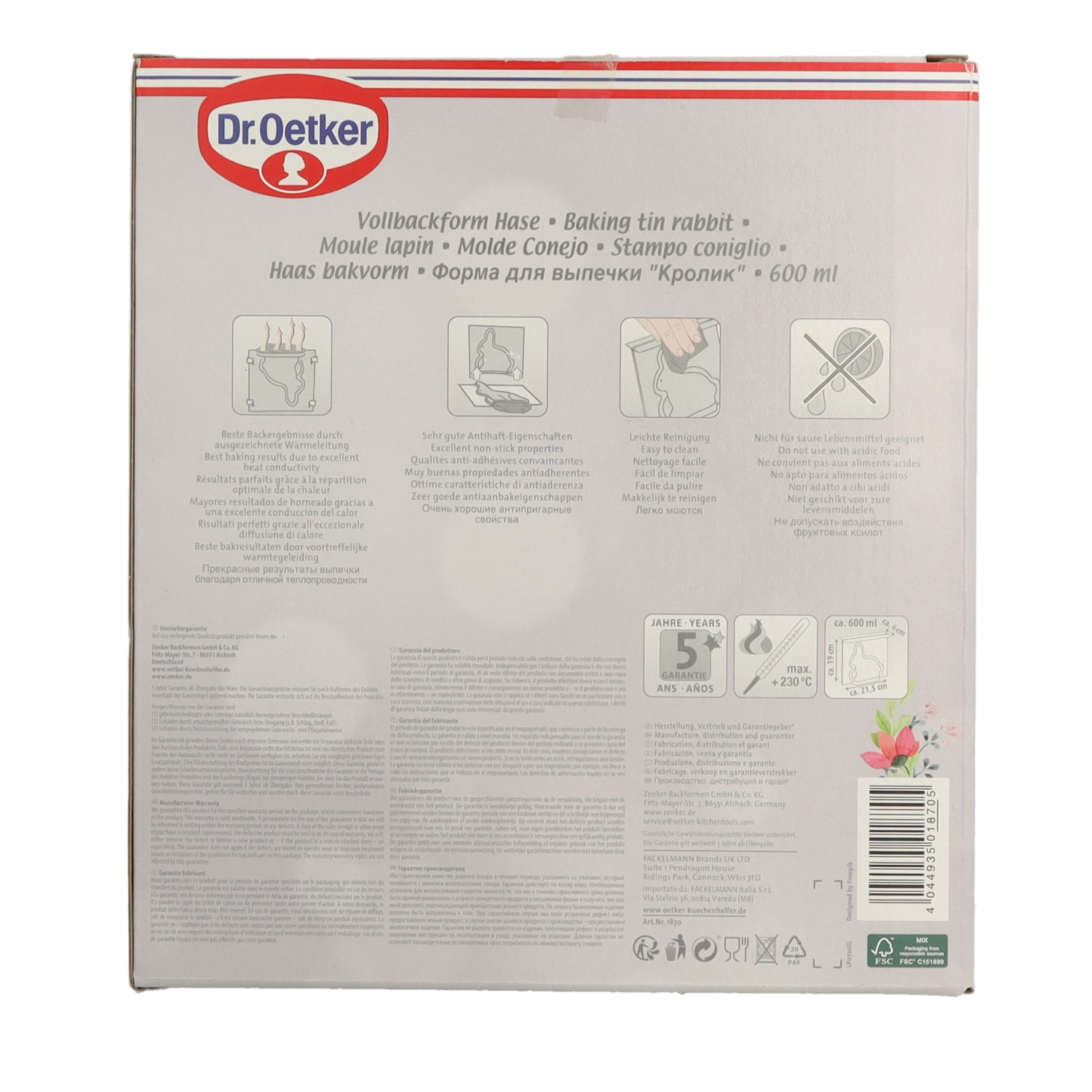 Backe niedliche Kuchen in Form eines Kaninchens mit der Dr. Oetker Backform „Kaninchen“! Diese hochwertige Backform ist ideal für Ostergebäck, Kindergeburtstage oder andere besondere Anlässe. Mit einem Fassungsvermögen von 600 ml und der hochwertigen Antihaftbeschichtung gelingen deine Kreationen perfekt und lösen sich leicht aus der Form.