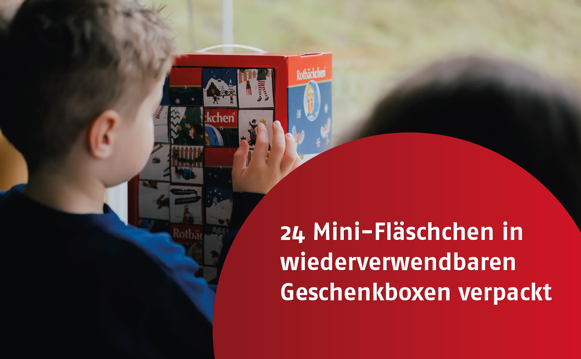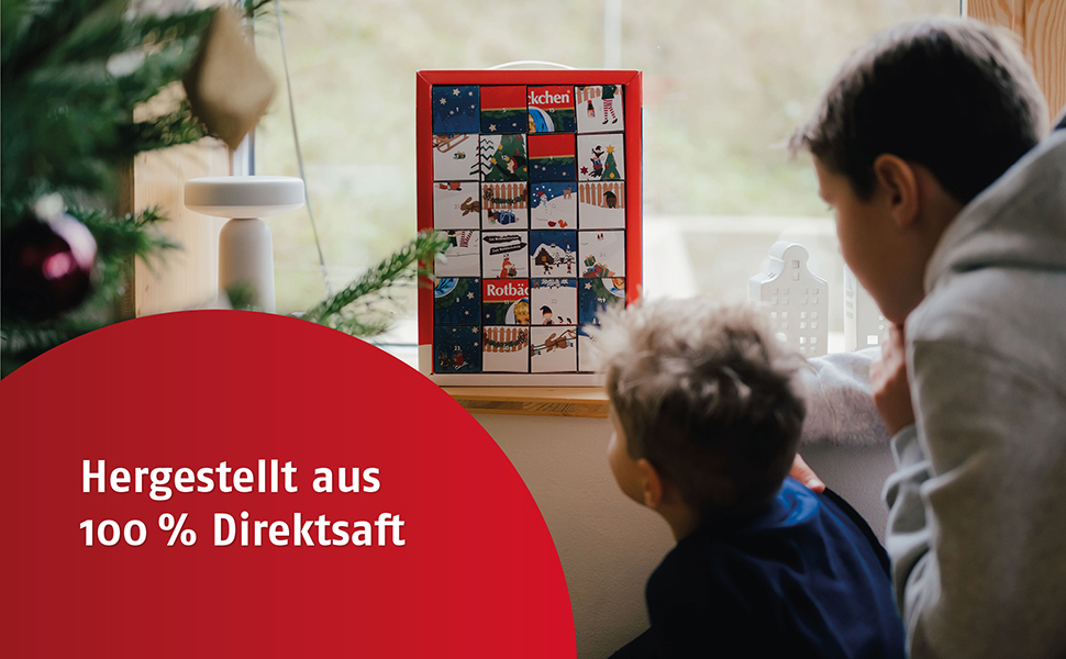 24 liebevoll gestaltete Türchen, gefüllt mit 125 ml Glasfläschchen – 8 sorgfältig ausgewählte Rotbäckchen-Saftsorten, bekannt für ihre hohe Qualität. Ein täglicher Vitaminkick für die Adventszeit – ganz ohne zugesetzten Zucker.