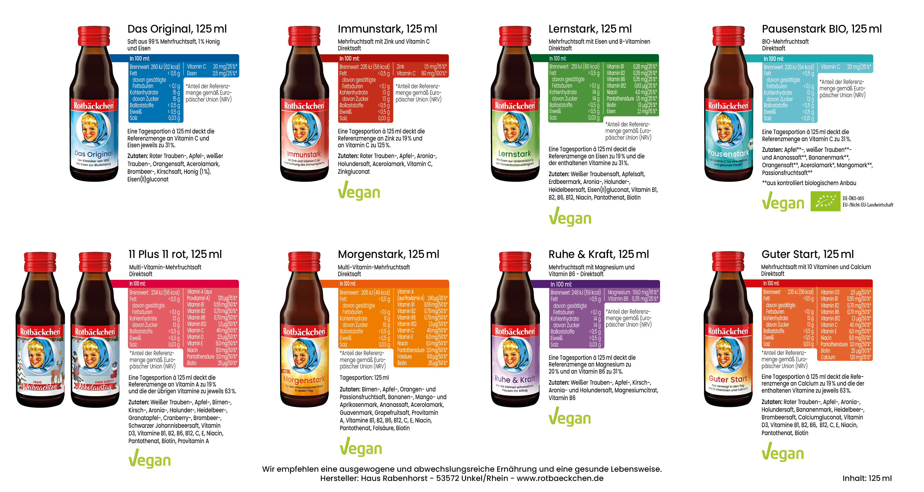 Roter Trauben-, Apfel-, weißer Trauben-, Orangensaft, Acerolamark, Brombeer-, Kirschsaft, Honig (1 %), Eisen(II)gluconat